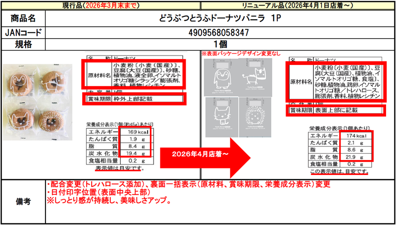 ・SOYドーナツは配合変更なし、商品サイズ、ダンボールサイズのみ変更となります。