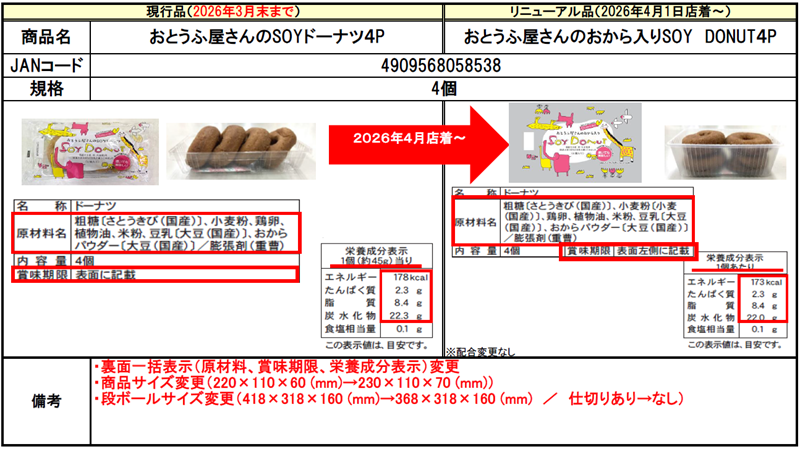 ・SOYドーナツは配合変更なし、商品サイズ、ダンボールサイズのみ変更となります。