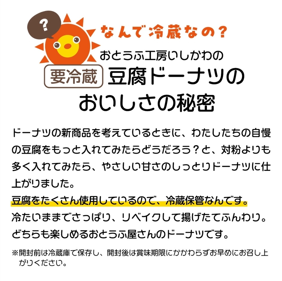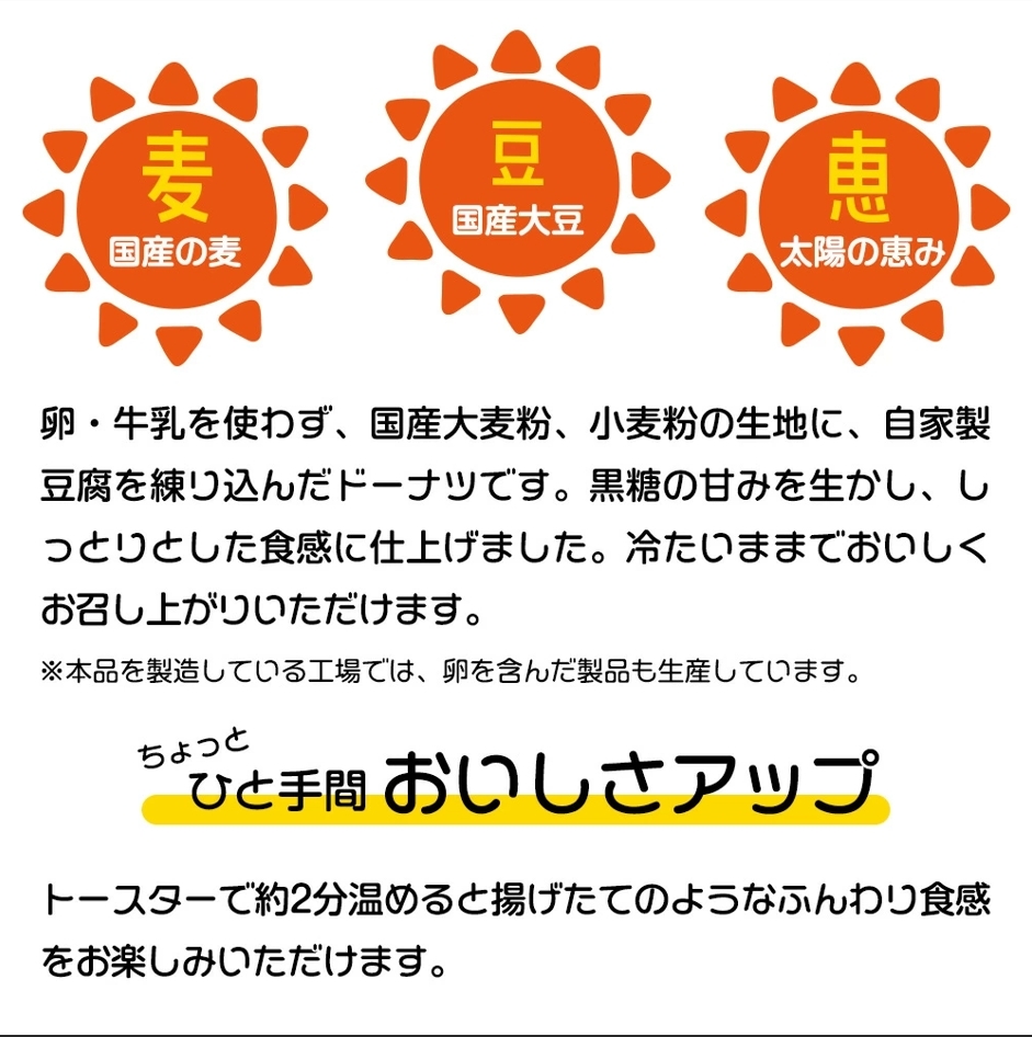 | 原材料 | 豆腐〔大豆(国産)、植物油、イソマルトオリゴ糖、食塩〕、植物油脂、大麦粉〔大麦(国産)〕、黒糖、ビートグラニュー糖、小麦粉〔小麦(国産)〕/トレハロース、膨張剤 |
